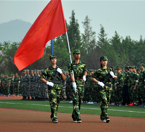 上午九点,在嘹亮的国歌声中,国旗缓缓升起,开学典礼正式开始。首先进行的是迎接军旗仪式,一位战士扛着军旗,两位战士荷枪左右护卫,伴随着嘹亮的军乐经过主席台,庄严肃穆。接下来进行的是新兵的分列式表演,由各列队分别表演,步伐整齐,口号嘹亮,赢得阵阵掌声。杜宝山宣读军训表彰文件,今年我校共有3700余名新生参加了军训,本次军训共评出10个班级为优秀集体、194名学生为军训“优秀个人”、65个寝室为军训“优秀寝室”。