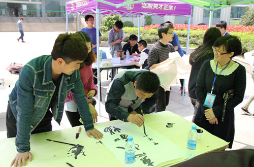 为提升我校学生在书画艺术方面的文化素养,挖掘师生在文化、艺术方面的能力,由商务系主办的现场书法大赛于4月15日在图书馆前举行。