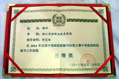 2013年5月25至26日,语言系文秘专业杜盼盼、刘俊江、郭洋3位同学在刘艺虹老师带领下代表我院首次参加全国秘书职业技能大赛,荣获团体三等,参赛的3位同学还分别获得了秘书职业基础知识、个人全能、工作技能3个单项三等奖。