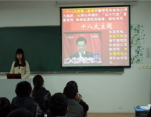 2012年12月6日晚上6时,为全面了解“十八大”实况,及时领会“十八大”精神,我系全体学生在各班教室观看了关于十八大报告会议的视频。