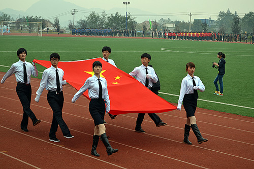 运动会开幕式在国旗护卫队和彩旗队入场式中拉开帷幕,裁判队和学院行政教职工及各系运动员代表队依次入场。