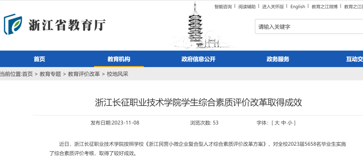 11月8日,浙江省教育厅网站以《浙江长征职业技术学院学生综合素质评价改革取得成效》为题,报道了我校持续深化教育评价改革,加快推动教育评价改革的标准化、体系化、规范化、数字化发展,不断提升学校治理能力和人才培养质量的经验做法。这是2022年9月5日我校《浙江民营小微企业复合型人才综合素质评价改革》成功入选浙江省深化新时代教育评价改革试点项目以来,教育厅网站第二次报道我校试点工作取得的成效。