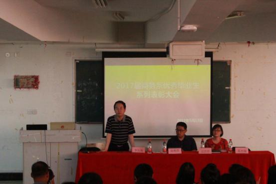 为了对2017届毕业生大学三年学业水平和顶岗实习进行总结和表彰,弘扬先进,激励士气,鼓舞干劲,使大一大二学生赶超有方向、有目标,对未来和人生有更深入的规划,5月17日下午2:00,商务在2218阶梯教室举行了“2017届优秀毕业生表彰大会”。学院学工部长陆栋煜老师到会颁奖,系主任李庆海、党总支副书记过芹芹到会讲话,商务系全体教师、获奖的大三学生及部分大一大二班级代表共200多位师生参加表彰大会。系辅导员易烈翔主持会议。