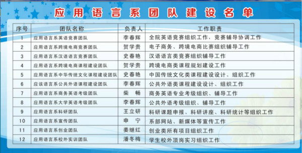 近几年来,应用语言系切实做好教师团队建设,充分发挥团队成员的合作精神和潜能,取得了不俗的成绩。本学期,在以往的4个教师工作团队的基础上,语言系又组建了8个教师团队。这些团队的成员均为自愿申报,系部核准。