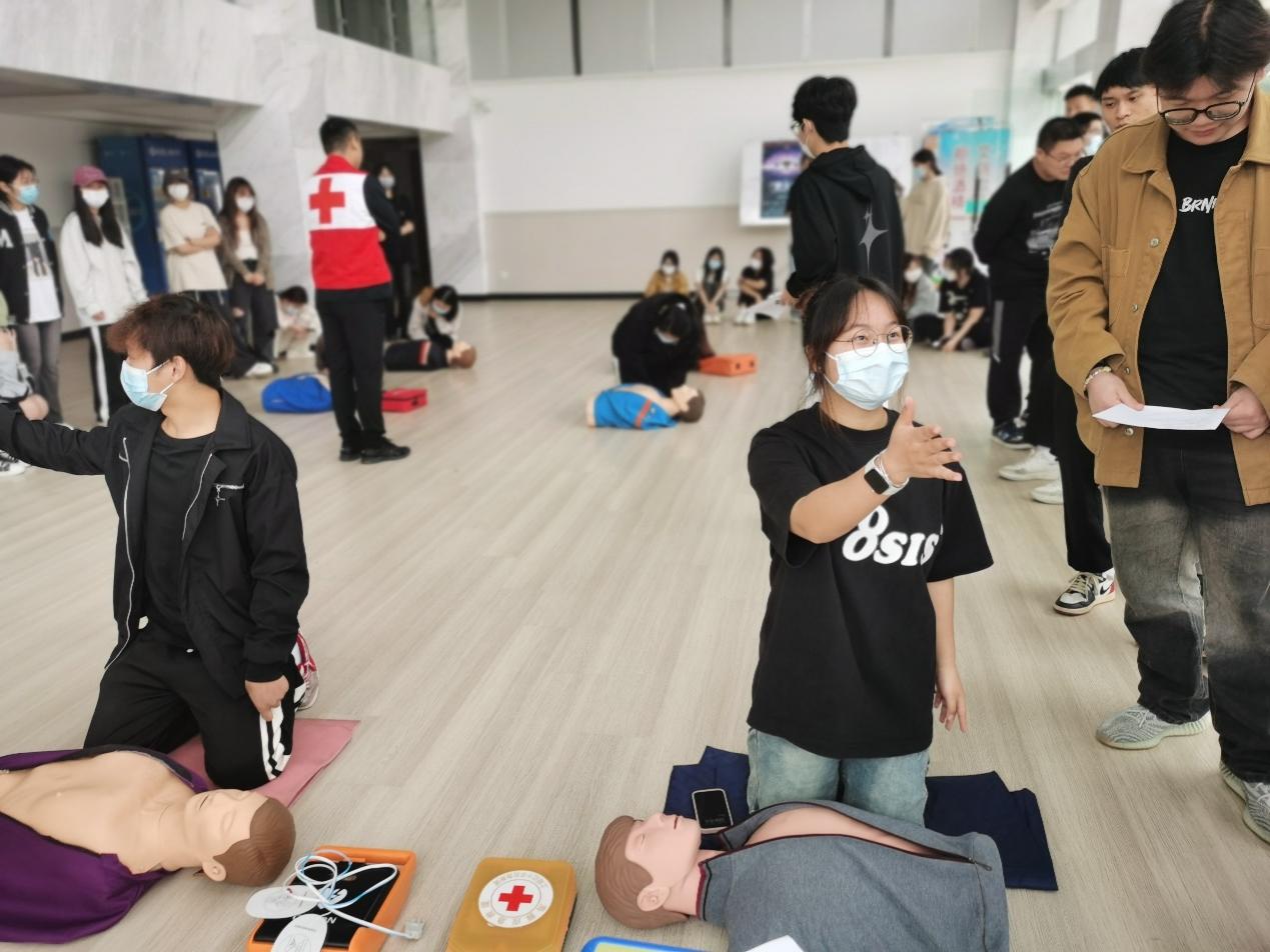 培训以线上理论课程和线下实践课程相结合的方式展开。通过线上课程的预先学习,大家初步了解了安全突发事故自救、互救知识。线下实践培训内容主要包括创伤处置、止血包扎、常见意外应对措施、海姆利克急救法以及心肺复苏等。培训时,大家相互配合,积极练习。在专业人员的指导下,同学们分组进行了心肺复苏的模拟操作。培训专家从步骤规范、动作要领、注意事项等方面对师生进行了一对一指导和纠正,确保每一位学生都能做到正确规范操作。