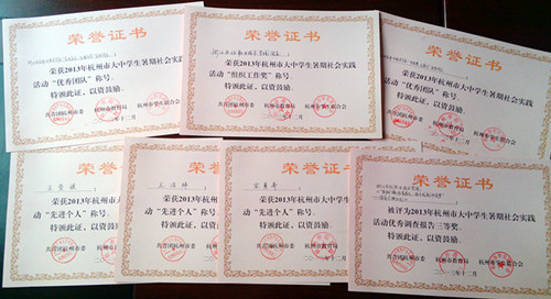 我院团委荣获2013年杭州市大中学生暑期社会实践活动“组织工作奖称号”;其中,“中国梦,志愿行”和“走进传播生态” 等两个实践团队荣获 “优秀团队”奖;王洁炜、宋勇奔、王莹琪等三名同学荣获“先进个人” 称号。(院团委供稿)