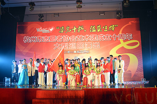 为纪念毛泽东1942年5月23日《延安文艺座谈会上的讲话》发表七十周年暨庆祝杭州志愿者协会艺术团成立10周年,5月23日晚6::30,以“鎏光十载,艺溢生辉”为主题的大型巡回表演在我院体育馆隆重举行。杭州市志愿者协会副秘书长陈碧红,杭州市志愿者协会艺术团团长李慧忠、副团长胡立炜,我院党政领导、团委、学生处、图书馆部门负责人及来自浙江工业大学、浙江科技学院、浙江外国语学院等兄弟院校及我院的师生代表观看了演出。