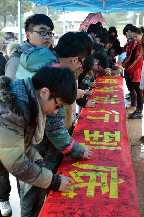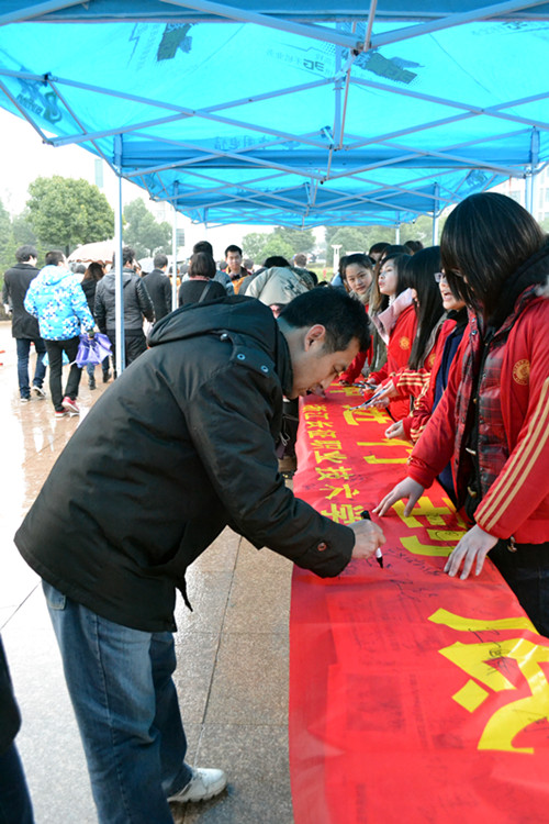 今年是毛主席题词“向雷锋同志学习”49周年,为大力弘扬雷锋精神和”奉献、友爱、互助、进步”的志愿者精神。3月5日,由团委主办的雷锋精神签名活动在图书馆前广场顺利举行。学院领导和广大学生伴随着《学习雷锋好榜样》的歌声,纷纷在印有“将雷锋精神进行到底”的横幅上签字。学院党委副书记洪骏在现场鼓励我院学子要学习雷锋精神,争做四有青年。大雨也挡不住广大学生积极传承雷锋精神的热情,在短短两个小时里,就有近千个签名,同学们的热情传遍整个校园,感染更多的学生积极参与到雷锋日的活动中。