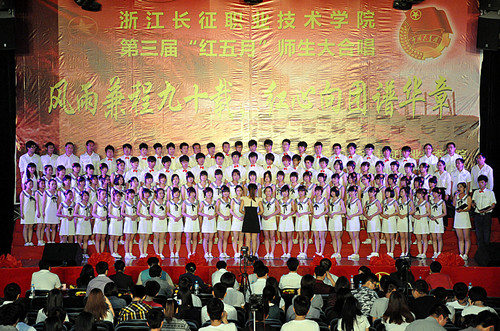 火红五月,激情飞扬。5月9日下午2:00,为庆祝共青团建团九十周年,浙江长征职业技术学院以“风雨兼程九十载,红心向团谱华章”为主题的第三届“红五月”师生大合唱在院体育馆隆重举行。