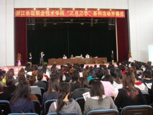 2010年4月12日中午12点,浙江长征职业技术学院“三月三节”系列活动开幕式在学院体育馆隆重举行。出席开幕式的有学院执行院长吕振合、副院长贺旭辉、院长助理杜丹,管理系主任李庆海、语言系主任麻晓燕、团委书记陶元,各系团总支书记以及近200位各系学生代表。